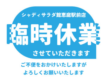 お知らせ一覧 シャディサラダ館恵庭駅前店 2026/03/06 シャディサラダ館恵庭駅前店 シャディサラダ館恵庭駅前店 臨時休業のお知らせ 2025/11/21 シャディサラダ館恵庭駅前店 恵庭商工会議所「福みみ情報2025冬号」にお得なクーポン掲載!